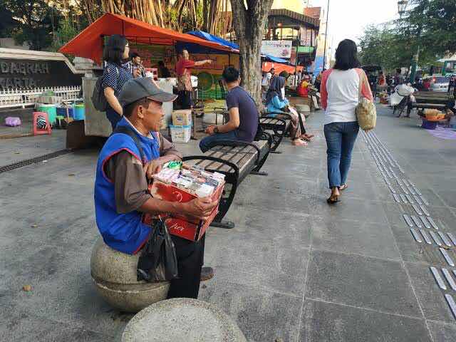 Nah, sambil nunggu hujan reda, aku membayar makananku. Saat membayar inilah mataku tertuju pada sosok kakek penjual rokok asongan dan sosok nenek yang juga penjual rokok asongan. Di kaos belakang mereka tertulis intinya perkumpulan pedagang asongan Malioboro. Mereka membawa dagangan berupa box kayu berisi dagangan mereka yang ditutupi plastik sambil tangan satunya memegang payung kecil untuk melindungi diri mereka dari hujan yang turun dengan derasnya.